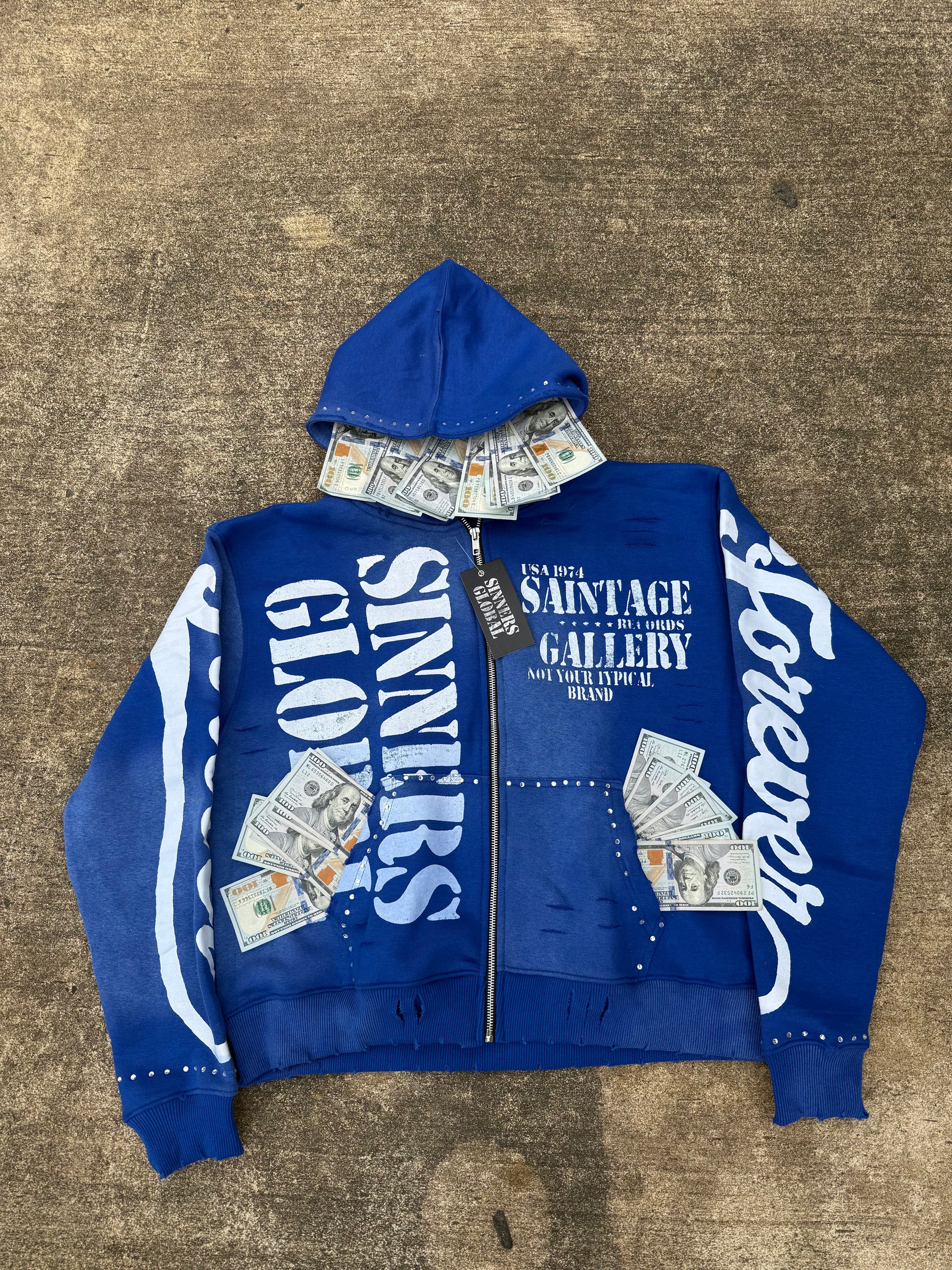 Details: Sunfaded distressing , rhinestone studded hood , pockets , and wrist , distressed stitching